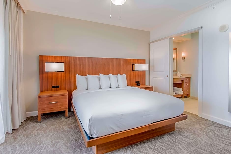 This spacious suite features a microwave, small refrigerator, and seating area with sofa bed.